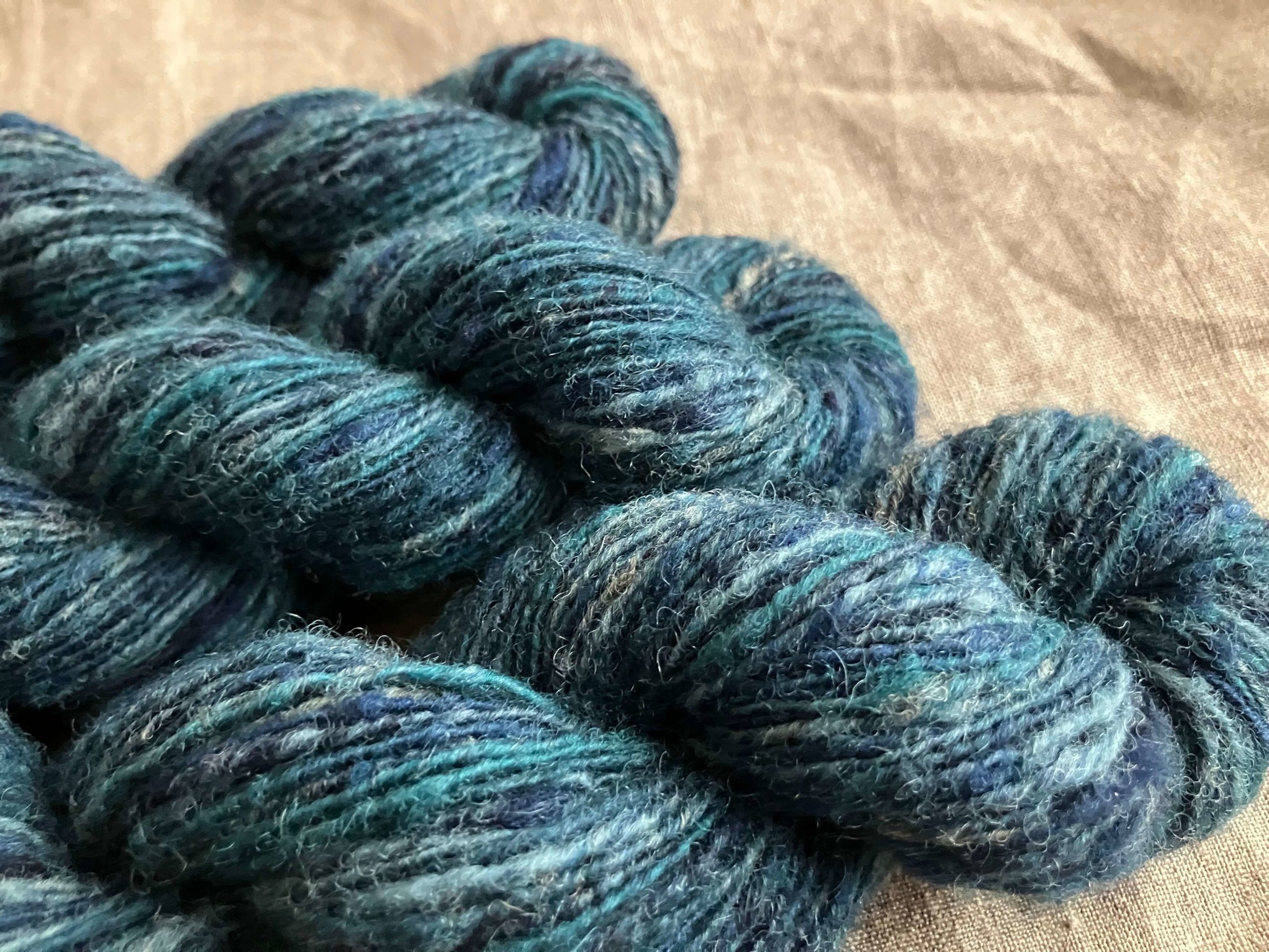 国産羊毛コリデール系を主に使用し、羊毛を洗うところから、草木や化学染料で染めて、足踏み紡ぎ車で糸に紡いでいます。